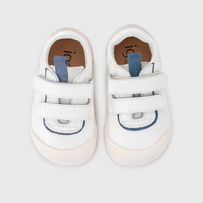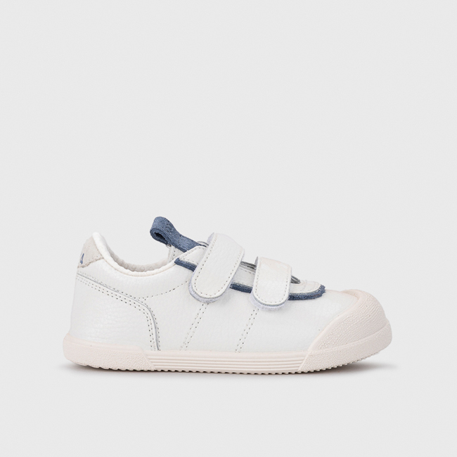 Bamba de piel, con patina protectora para darle un acabado liso y aportarle protección en el uso diario. Con forro textil. Se ajusta al pie con doble velcro en empeine. Suela con dibujo para aportar la tracción necesaria y puntera protegida.