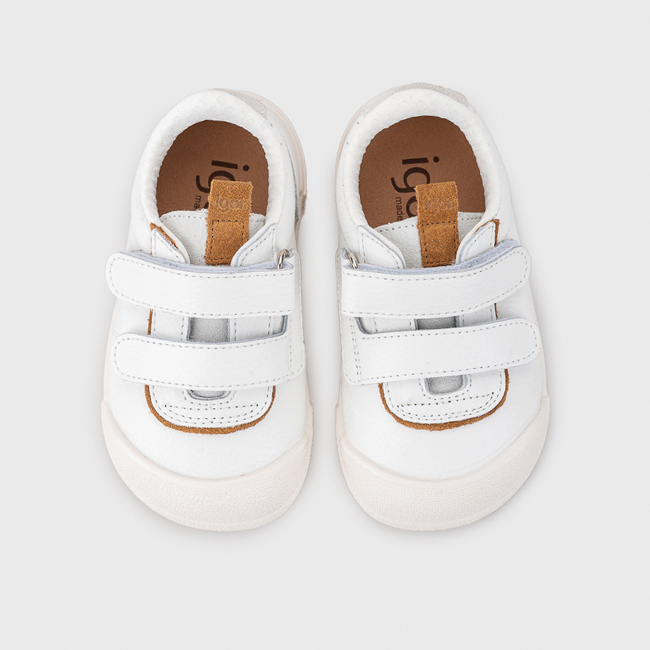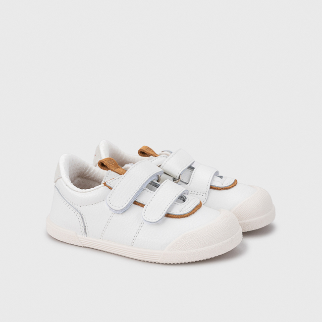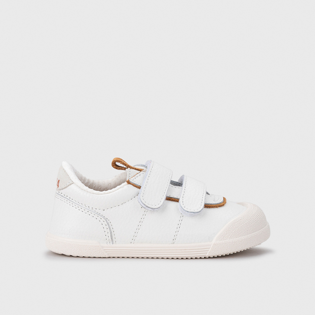 Bamba de piel, con patina protectora para darle un acabado liso y aportarle protección en el uso diario. Con forro textil. Se ajusta al pie con doble velcro en empeine. Suela con dibujo para aportar la tracción necesaria y puntera protegida.